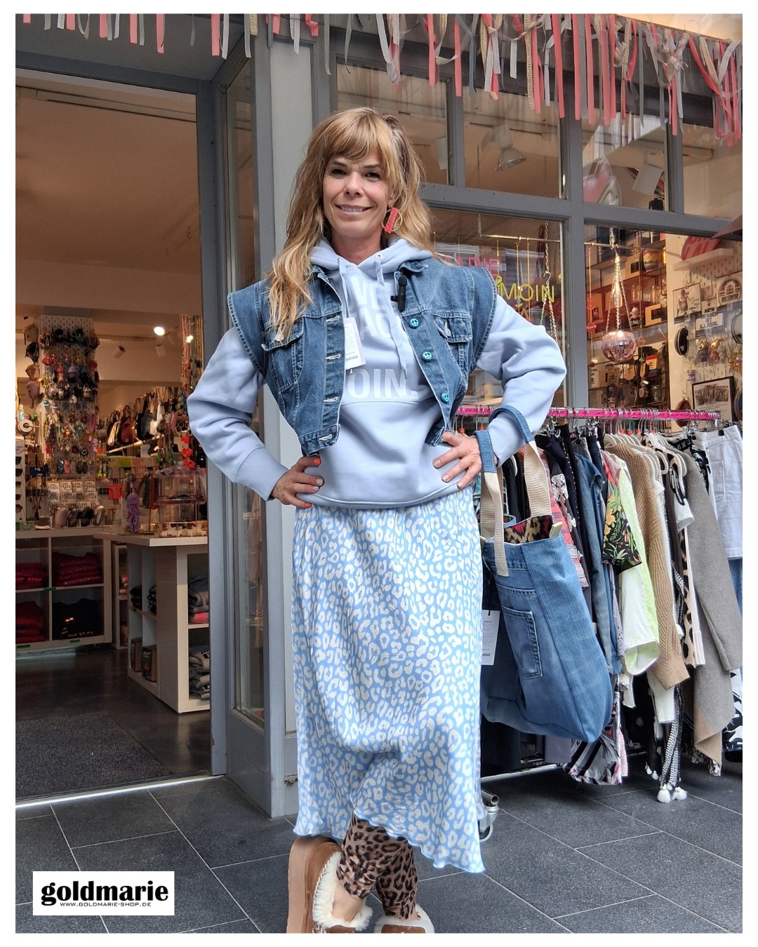 Unser Outfit-Tipp:goldmarie LOVE PEACE MOIN Hoodie - eisblau mit Glitzer kombiniert mit goldmarie Jeansweste LOVE PEACE MOIN - NR 6 PEACE Knöpfe - Recycelt aus einer Jeansjacke - denim blau, goldmarie Rock LOVE PEACE MOIN Leo Muster - hellblau-creme und goldmarie Shopper Tasche JEANS Recycelt - LOVE IS MY SUPERPOWER - NR 5 - reversible - denim washed - 37x38x15cm.