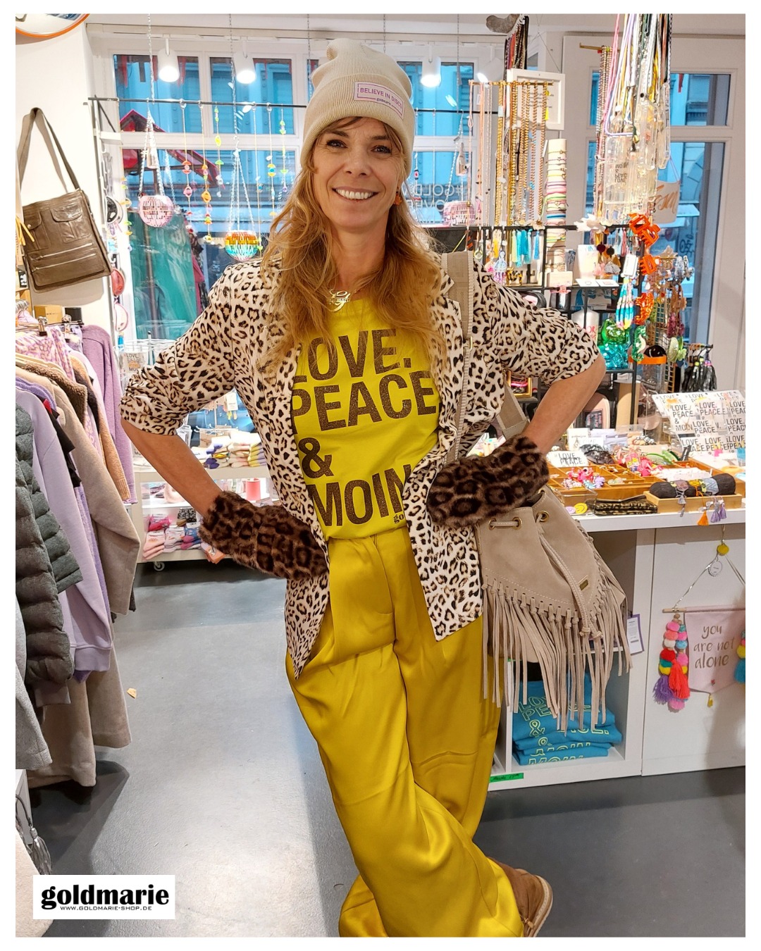 Leo-Blazer mit Power trifft auf LOVE PEACE MOIN Statement-Shirt