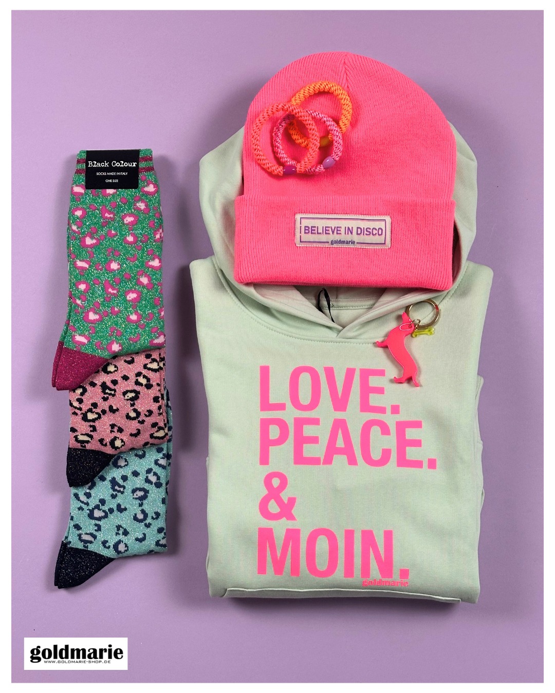 Veröffentlicht am 23.02.2026Manchmal braucht es nur drei starke Worte: LOVE. PEACE. & MOIN - Unser mintfarbener Sweatshirt Kapuzenpulli für Kids und Erwachsene mit Neon-Pink-Print bringt Hamburg-Charme und gute Laune in einen Look. Dazu kombiniert: Glitzer-Socken von der Marke BLACK COLOUR und eine pinke Beanie Mütze und daraus wird ein echtes Farb-Statement. Für Kinder gibt es den Hoodie ganz regulär, für Erwachsene nur noch ganz wenige im Sale. Also… lieber jetzt als „ach hätte ich doch“ :-)