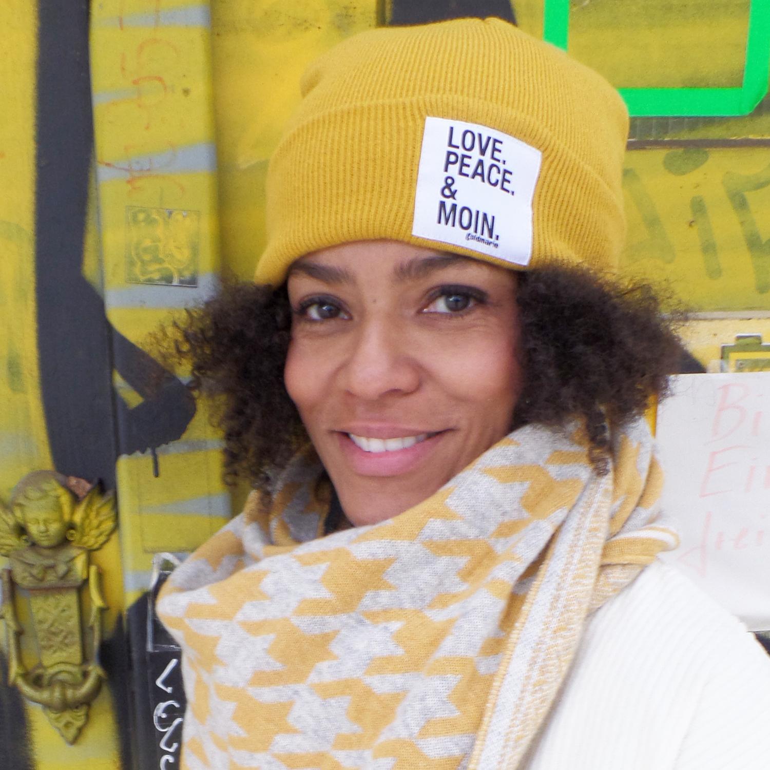 goldmarie Beanie Mütze LOVE PEACE MOIN Klassik- gelb