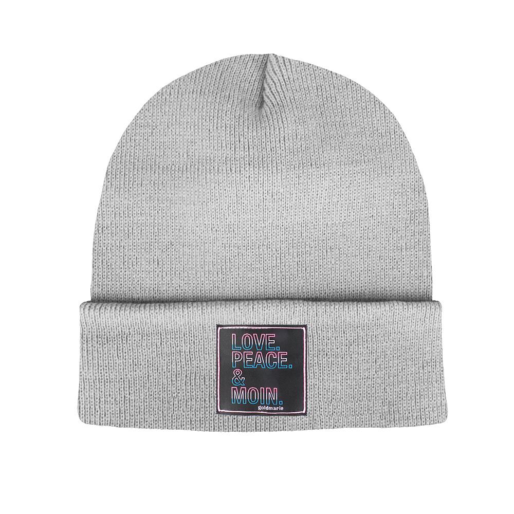 goldmarie Beanie Mütze LOVE PEACE MOIN Neonschrift Label - grau