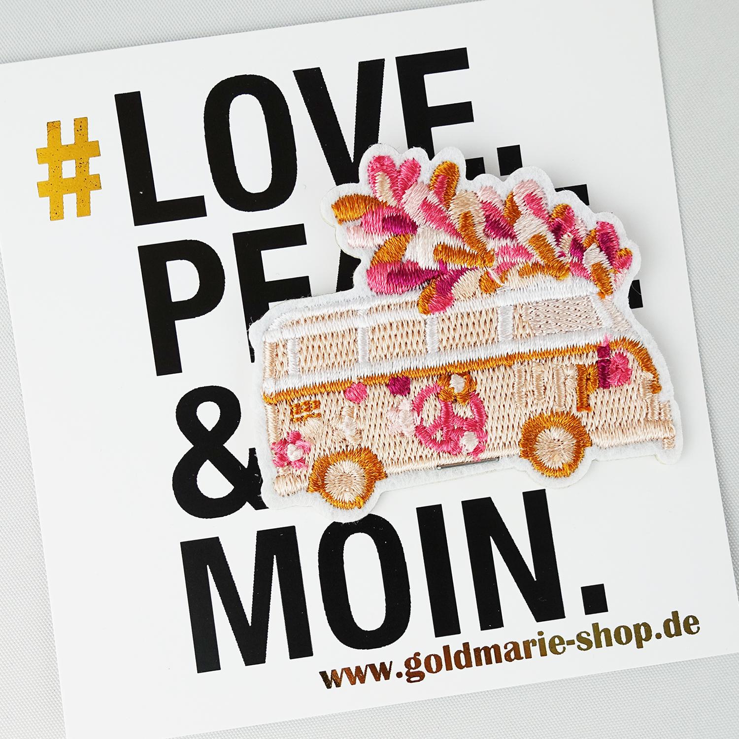 goldmarie Patches im HIPPY BUS Design gefertigt. Der Aufnäher kann je nach Bedarf aufgebügelt oder aufgenäht werden und ist vielseitig stylebar, z.B. auf DIY-Jacken, Jeans, Taschen, Hosen, T-Shirts, Mäntel, Röcke usw.