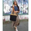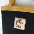 goldmarie Tasche aus robustem Canvas Stoff, im Shopper Design, mit "LOVE PEACE MOIN" Leo Look Label (Farbe: lilac, gelb, schwarz) und Leder Taschenhenkel (Farbe: camel, Vintage Look) gefertigt. Die Tasche ist mit einem Druckkopf verschließbar und innen mit einem großen und einem kleinen Taschenfach (mit Reißverschluss) ausgestattet.